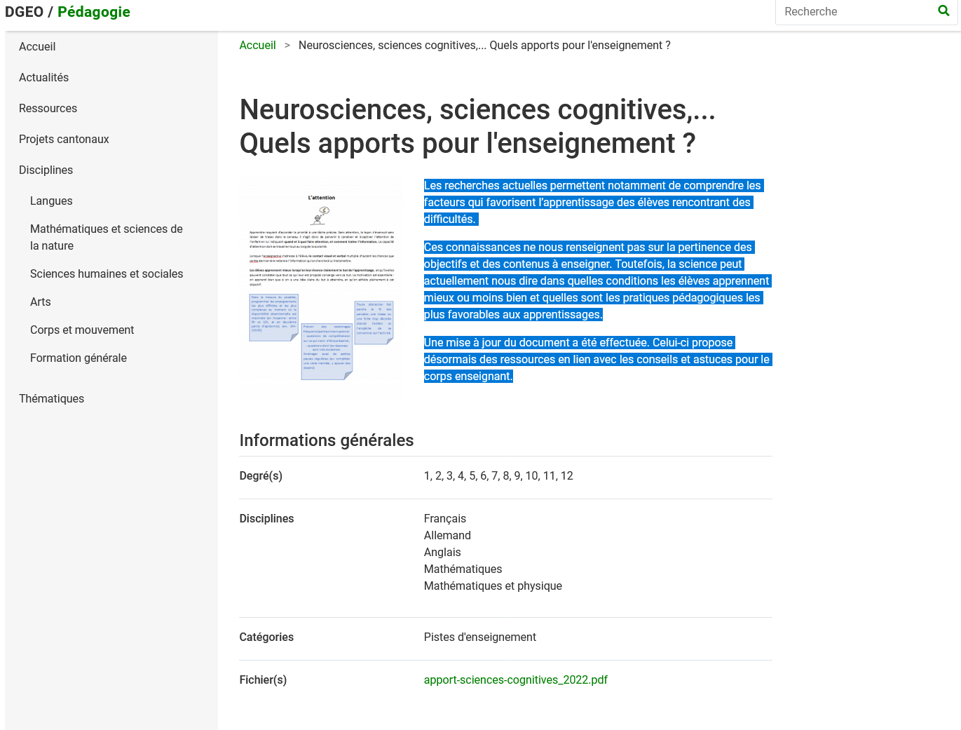 " Les recherches actuelles permettent notamment de comprendre les facteurs qui favorisent l’apprentissage des élèves rencontrant des difficultés. Ces connaissances ne nous renseignent pas sur la pertinence des objectifs et des contenus à enseigner. Toutefois, la science peut actuellement nous dire (...)