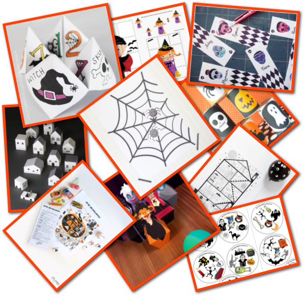 La cocotte en papier d’Halloween Le jeu de l’oie d’Halloween Le Dobble revisité Le jeu de 7 familles Le jeu de quilles des méchants Disney Les puzzles à fabriquer Le jeu de bowling Accroche l’araignée! Le village d’halloween à créer Le maxi coloriage géant