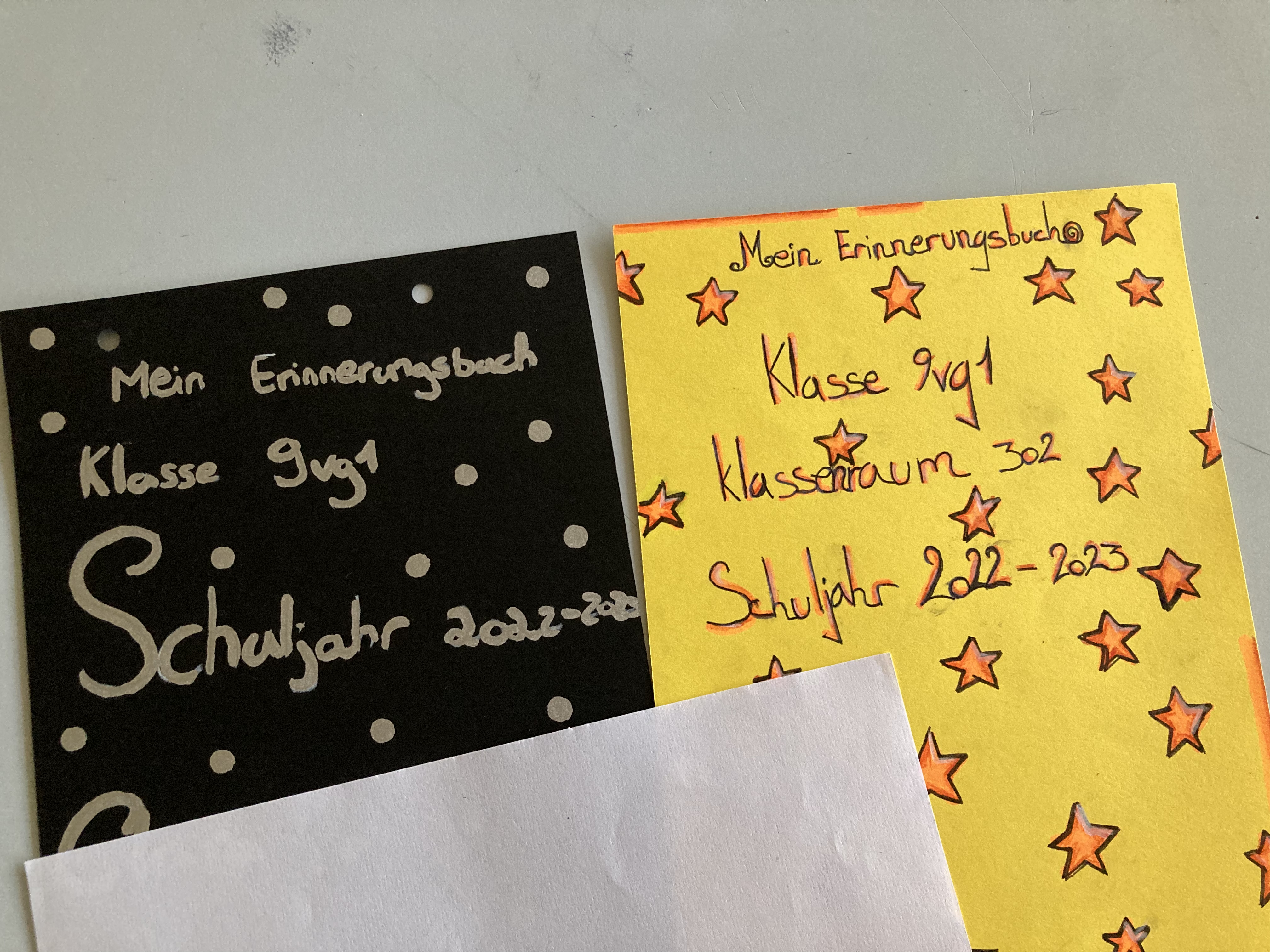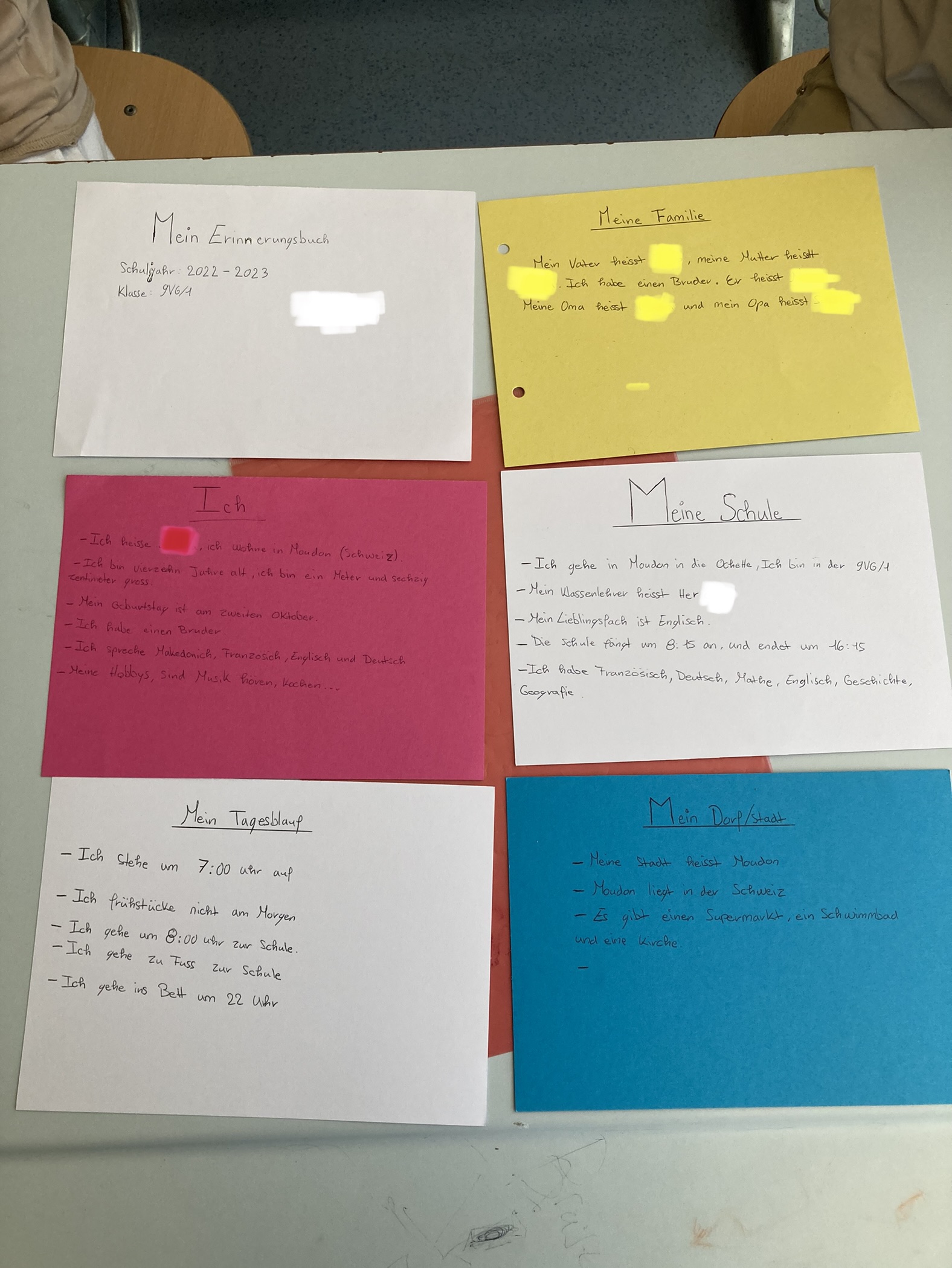 Je leur donne une feuille de brouillon A5 qu'ils utilisent en hauteur ou largeur, ils écrivent 1 page que je corrige. Après la correction, ils choississent 1 page A5 (que j'ai perforée) de la couleur de leur choix et ils mettent au propre. Ils peuvent aussi apporter des photos, dessiner, ... A la fin de l'année, je relie les pages avec un morceau de laine et ils peuvent mettre une page avec un titre: Mein Erinnerungsbuch 2018-2019. Klasse ... Mit Frau/Herrn, ...