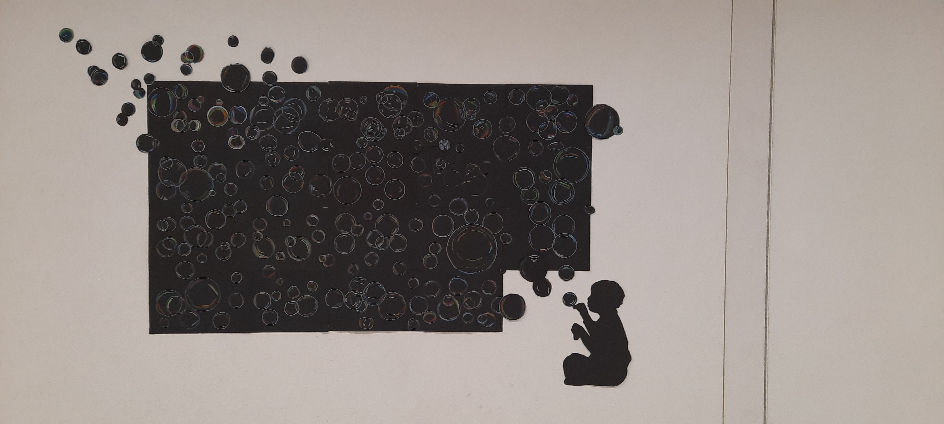 Sympa pour commencer l'année en art visuel, les élèves doivent obligatoirement parler avec leur "voisin de dessin" afin que les bulles qui sont sur plusieurs feuilles aient les mêmes couleurs, tailles et formes.