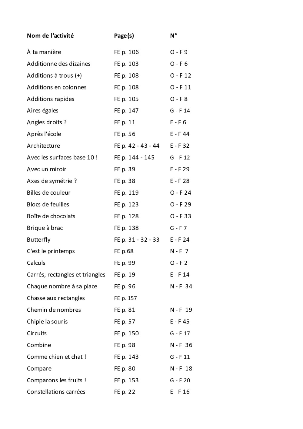Index des activités du livre et des fiches de maths 5P (nouveau moyen d'enseignement)