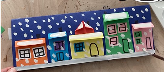 Donner des papiers de couleurs aux enfants. Leur mettre à disposition le "modèle fini". Consigne : reproduire cette rue... Mise en commun et discussion.