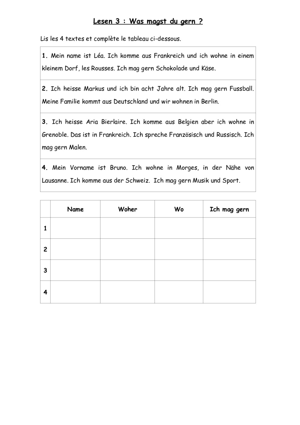 Des textes courts en allemand de 5P pour travailler des élèments des unités comme les langues, l'origine, l'âge, etc.