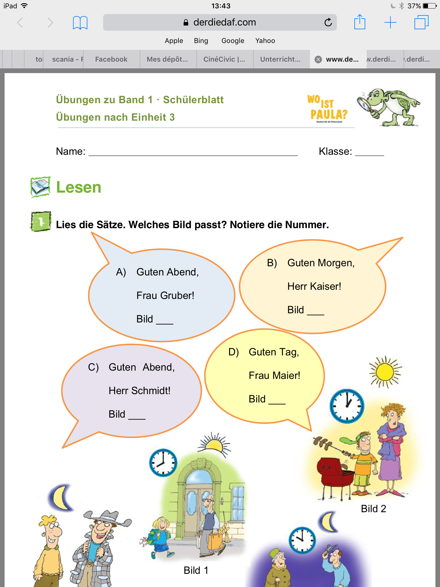 Fiche d'entraînement ou de révisions sur les heures en allemand. Possibilité de rajouter l'heure en numérique.