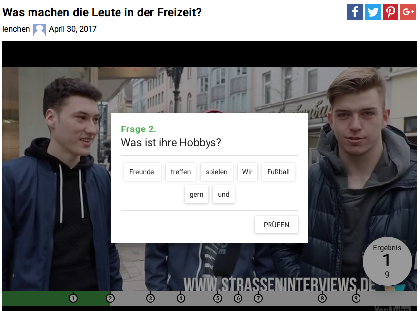 Une dizaine de vidéos afin d'entraîner la compréhension en allemand. Le film stoppe automatiquement après quelques instants et les élèves doivent alors répondre à des questions de compréhension . Activité à faire réaliser en classe ou à domicile comme devoir.