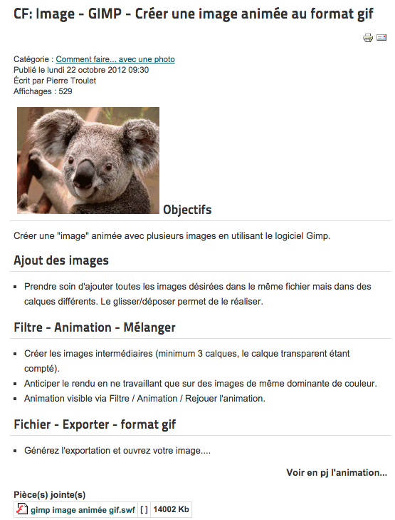 Séquence vidéo montrant comment créer une "image" animée avec plusieurs images : ajout des images filtre - animation - mélange exportation en format .gif Durée : 3' 25'' Auteur : Pierre Troulet