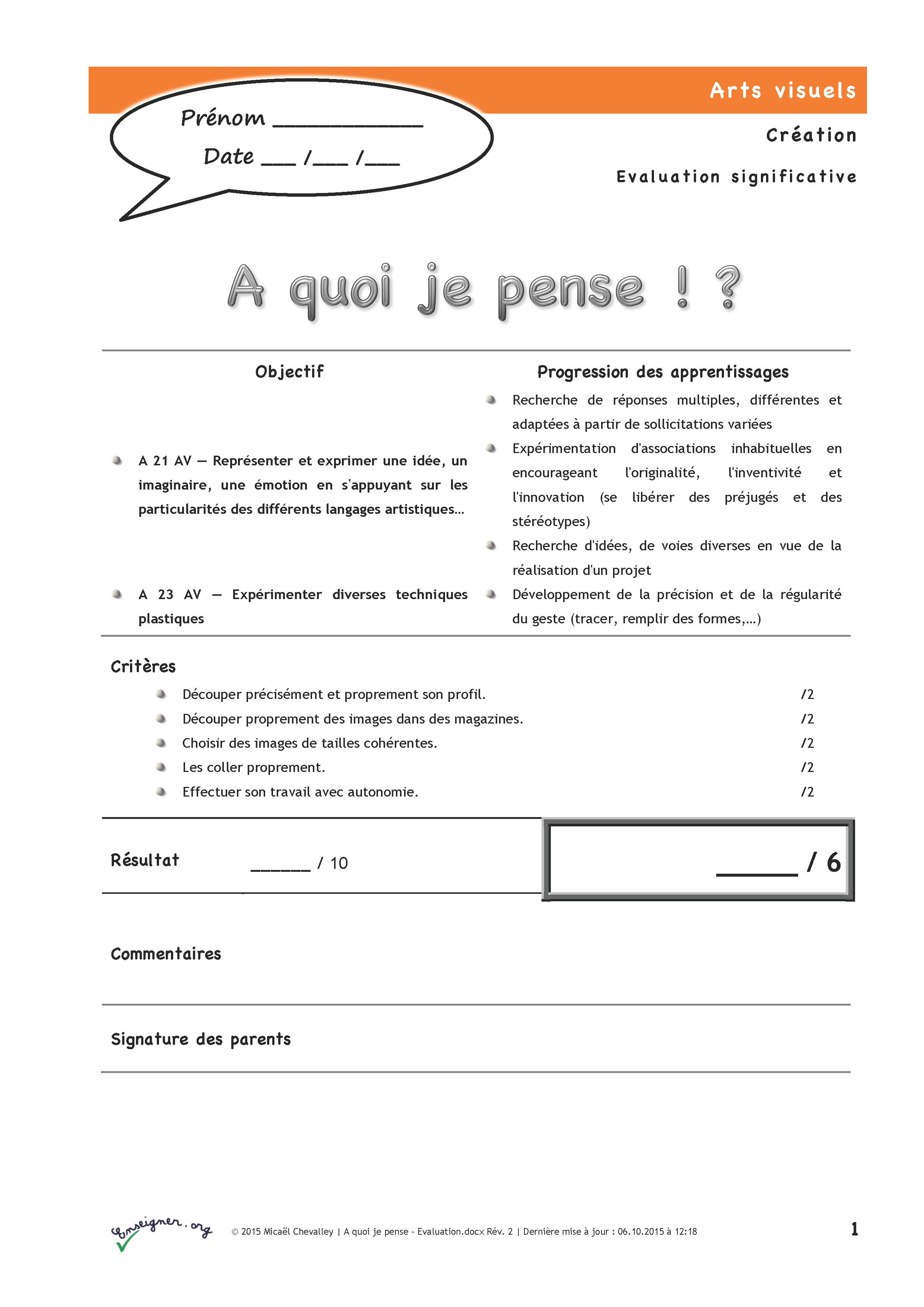 Activité de découpage/collage pour représenter quelques pensées dans la tête de nos élèves. Inclus : fiche d'évaluation fiche pour les élèves fiche pédagogique