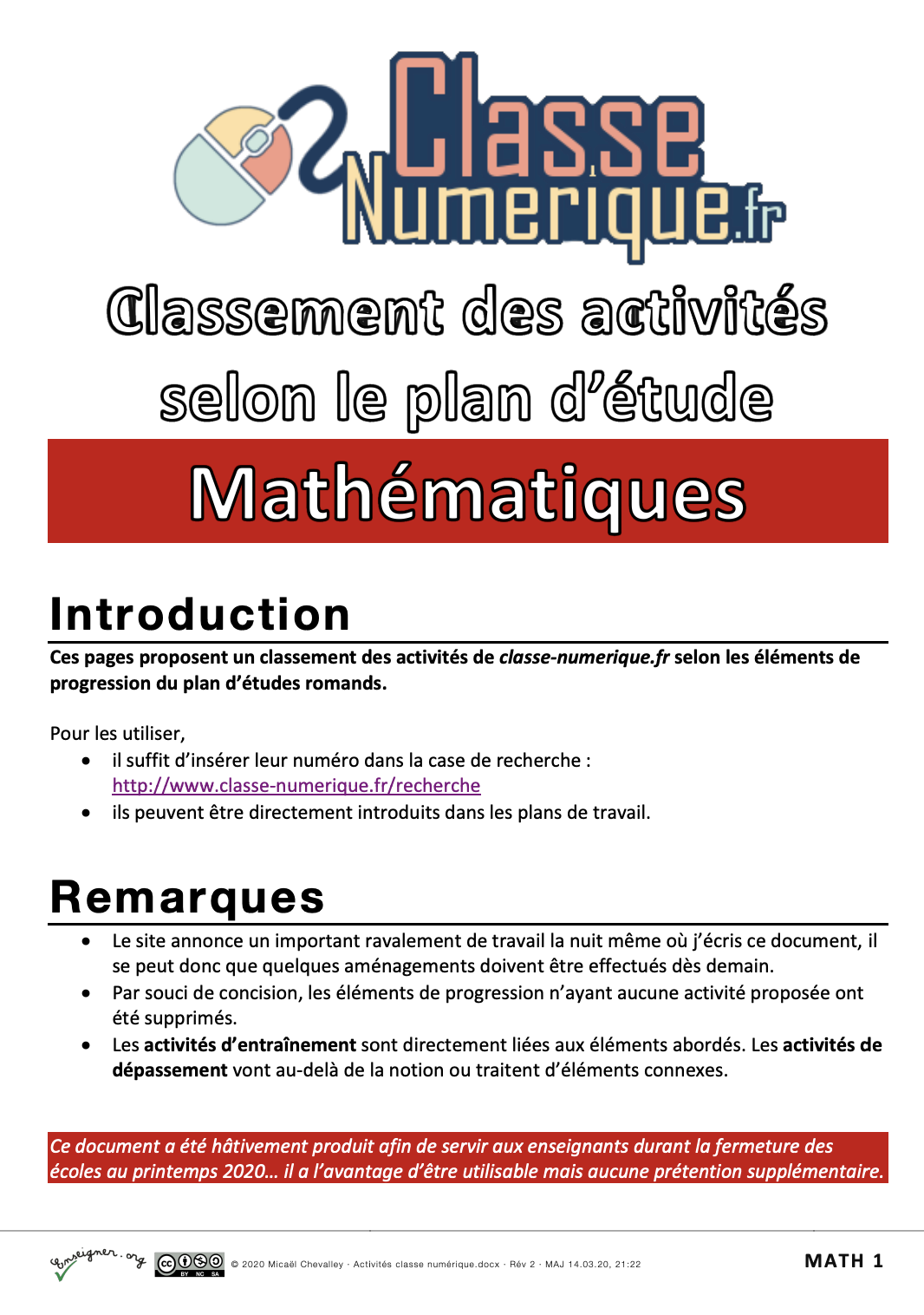 Afin de retrouver rapidement une activité compatible avec l'élément de progression du PER que vous travaillez, ce document vous présente pour chacune d'entre elle les activités qui correspondent. De quoi les renseigner rapidement à vos élèves. La classe-numerique.fr est un site qui regorge d (...)