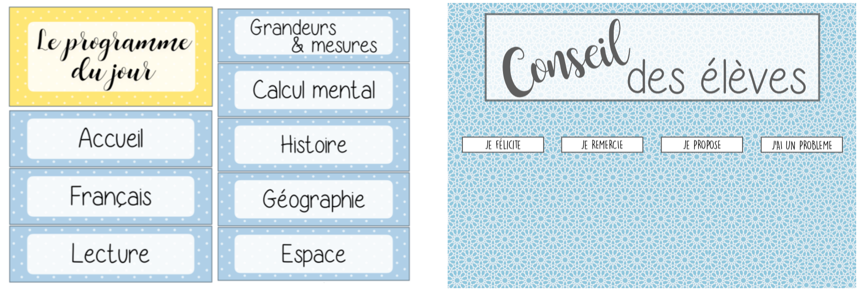 Plusieurs affichages proposé par maîtresse Mégane! Les responsabilités Le programme du jour Le conseil de classe Le coin de la maîtresse Les étoiles de la classe