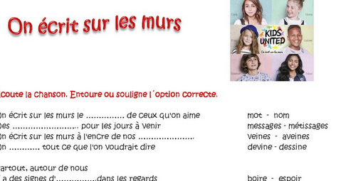 Ecoute...et choisis le mot correct. Cliquer sur le lien pour entendre la chanson : https://www.youtube.com/watch?v=VV5oVYVGfNc&t=8s