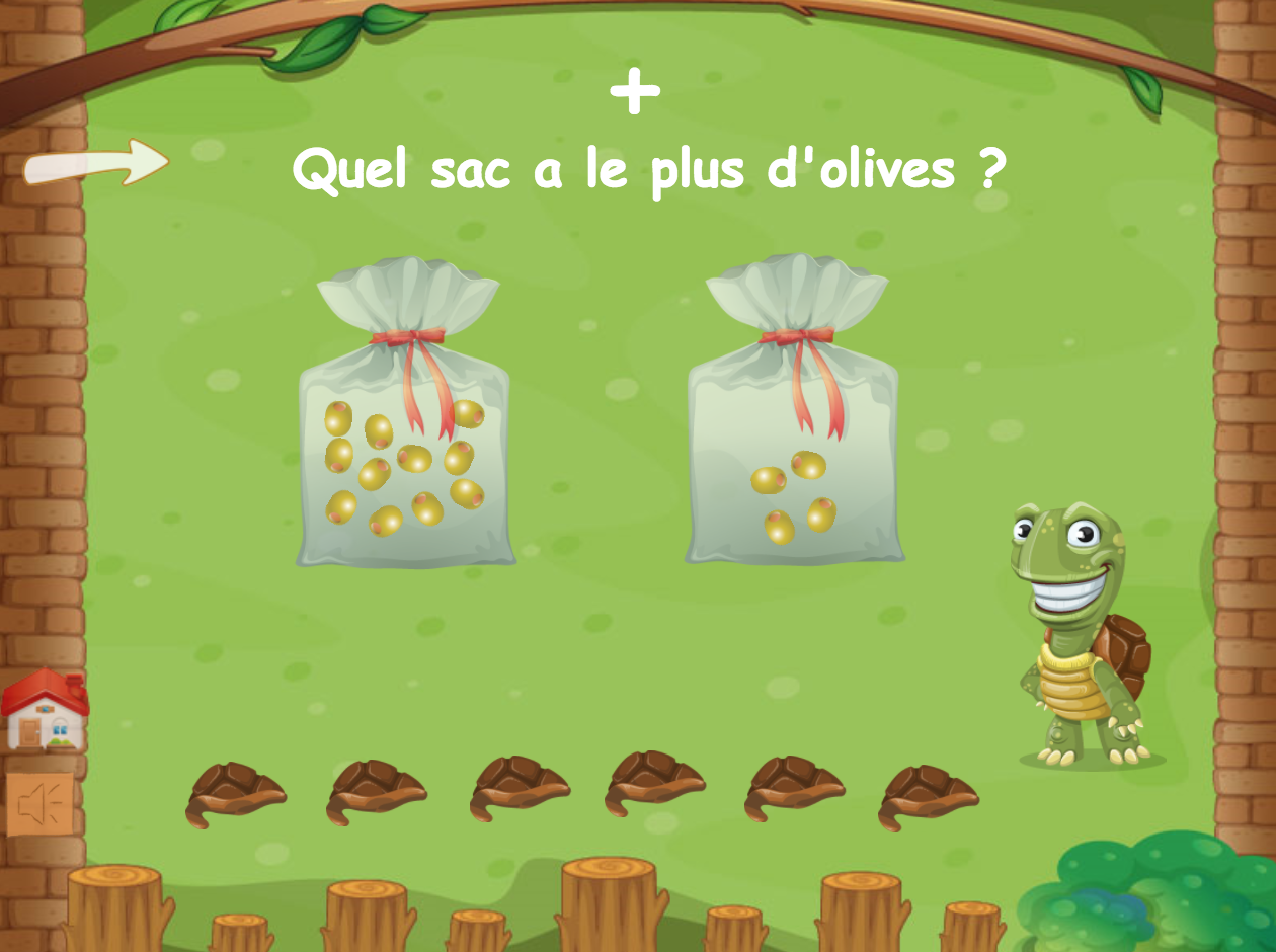 Pour les quantités, possibilité de sélectionner "plus", "moins", ou un mélange des deux. Pour le niveau "facile", possibilité de choisir l'interface: quantités d'objets dans des sacs, doigts de la main, ou oeufs dans un carton. Pour un niveau plus difficile, la version avec les oeufs dans un carton (...)