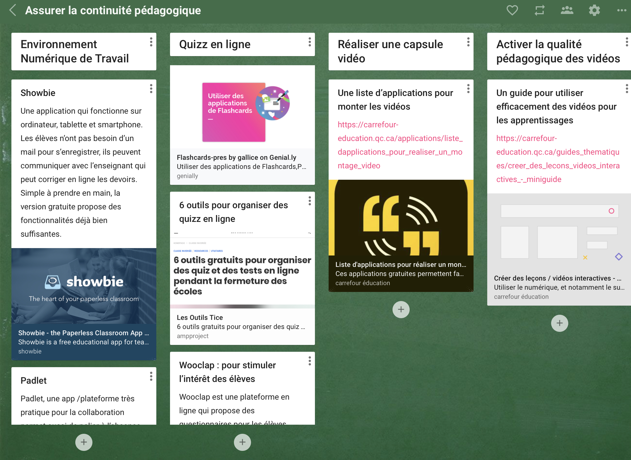 Padlet est une bonne plateforme collaborative. Ce Padlet est dédié aux outils et ressources pour l'enseignement à distance. C'est une co construction qui est évolutive et devrait notamment bénéficier des ressources des étudiants de la HEP. A consulter et re consulter régulièrement, à compléter par (...)