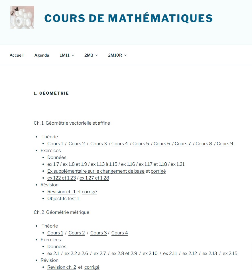 Supports de cours (auteur Mme Gelsomino) Ch. 1 Géométrie vectorielle et affine : Théorie, Exercices, exerices de révision, objectifs du test Ch. 2 Géométrie métrique : Théorie, Exercices, exerices de révision, objectifs du test