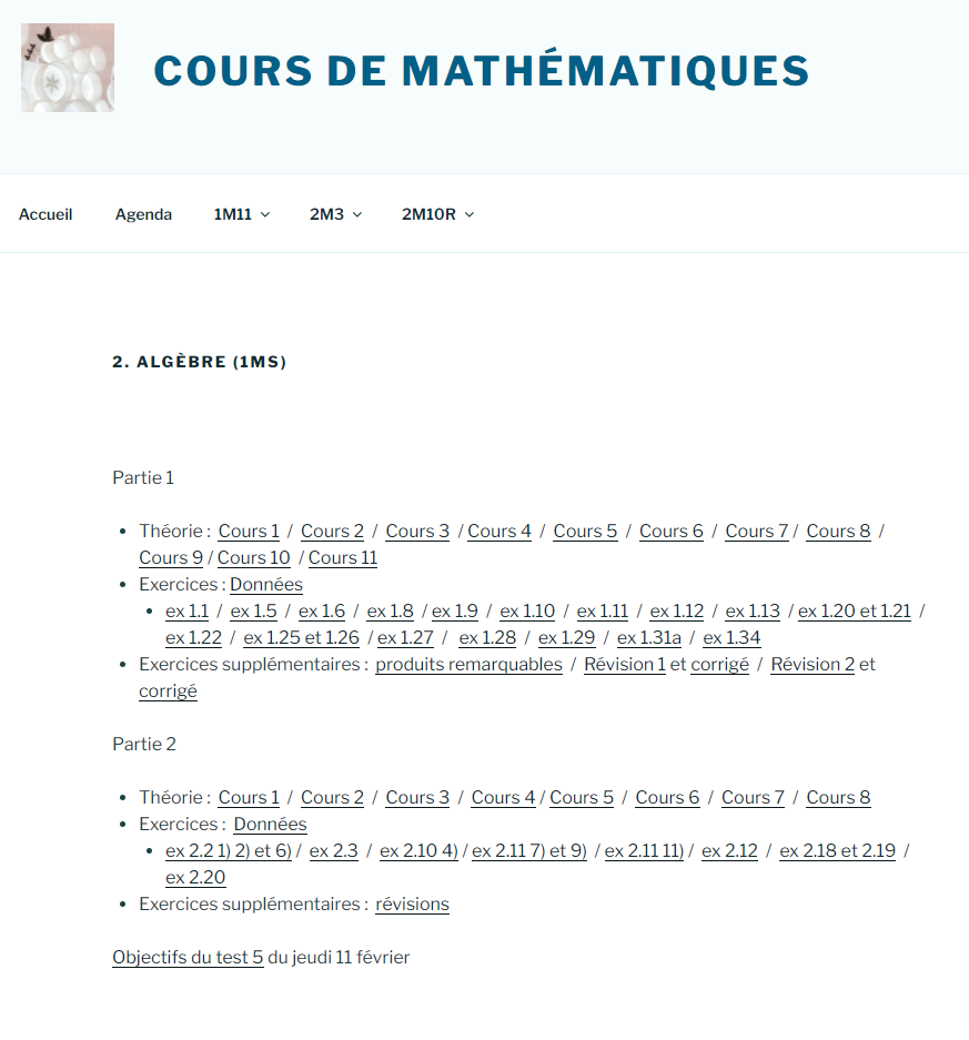 Supports de cours (auteur Mme Gelsomino) Partie 1 Calcul littéral, équation, ... : Théorie, Exercices, ... Partie 2 Fractions rationnelles, ... : Théorie, Exercices, exerices de révision, objectifs du test