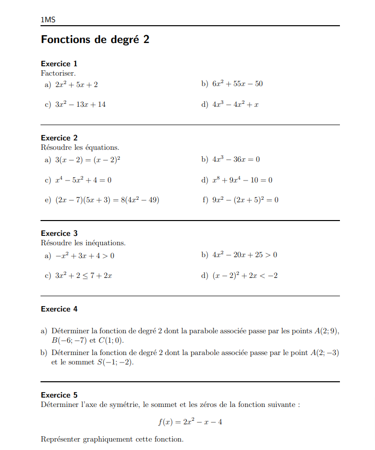 Exercices sur les fonctions (degré 2) + corrigé (1MS)