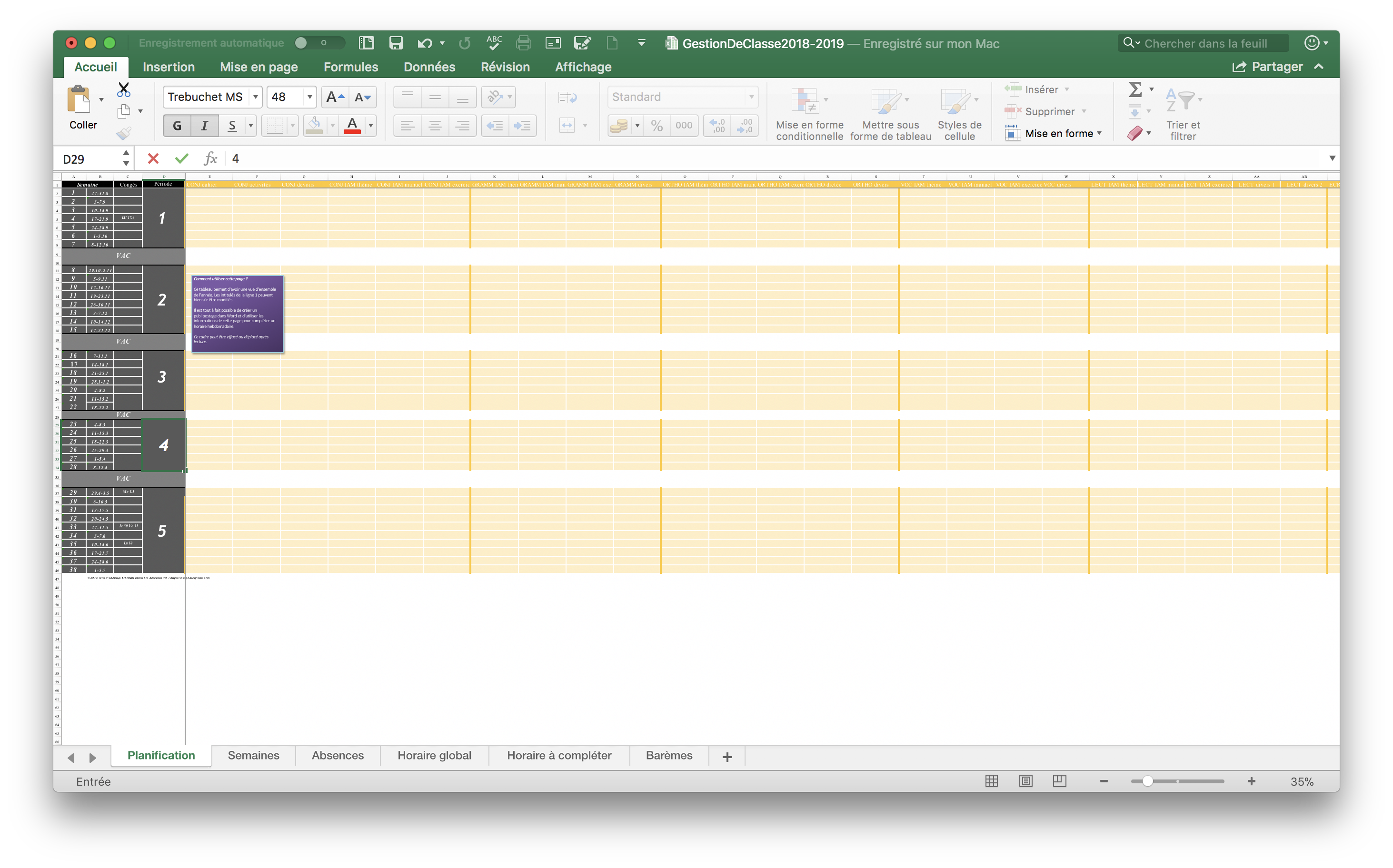 Dossier de gestion de classe version 2019-2020 : les absences la planification annuelle la planification des semaines pour les duos le plan de la semaine le programme hebdomadaire les notes (générateur DGEO) L'onglet "Absences" est toujours présent même si le canton de Vaud les gère de manière (...)