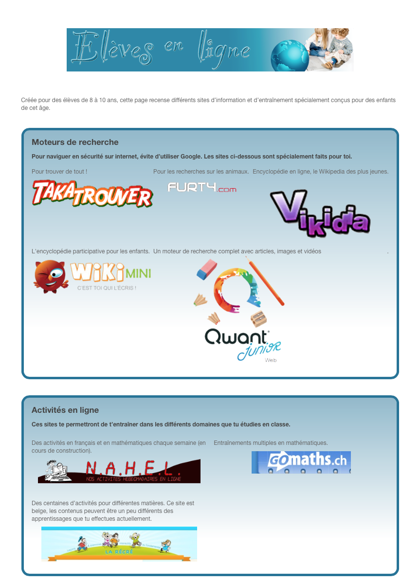 Nos élèves travaillent de plus en plus sur internet, à la maison ou à l'école. Cette simple page internet leur permet d'avoir sous la main des moteurs de recherche et des sites d'entraînement.