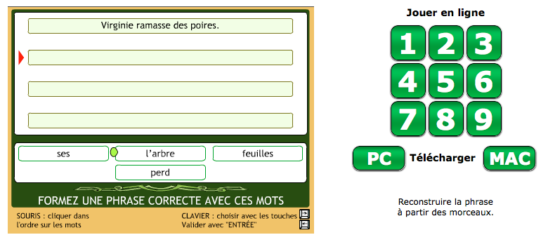 Ce didacticiel est composé de neuf exercices travaillant sur la construction de la phrase (sujet, verbe, complément). Les mots sont donnés dans le désordre, à l'élève de les remettre dans le bon ordre.