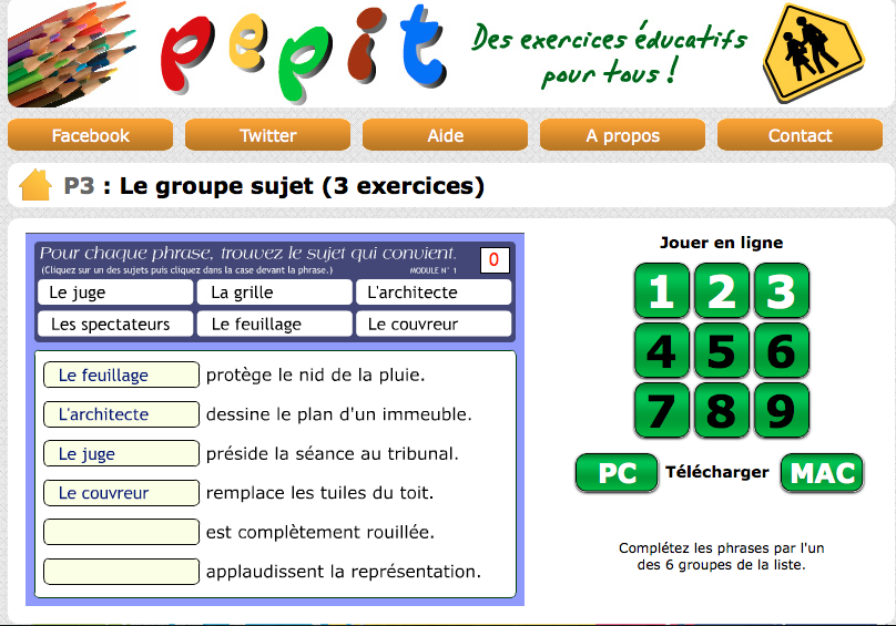 Il s'agit d'exercices interactifs sur "le groupe sujet". Ce lien contient cinq modules différents (ne correspond pas à l'ordre de difficulté) dans lesquels les élèves doivent relier les groupes sujets aux groupe verbaux. Il est intéressant pour les 4P. Il peut poser certains problèmes au niveau du (...)