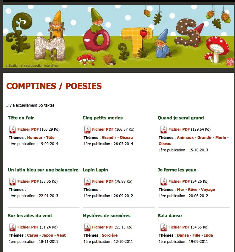 Comptines / Poésies Histoires Histoires courtes Histoire de son Petites rimes pour... Mini-Romans Théâtre Jeux de mots Atelier d'écriture Cub'Histoires...etc.... Arrêtez-vous dans cet univers....vous ne serez jamais déçus ! Marie-Hélène Lafond écrit également des livres pour enfants. Que du bonheur (...)