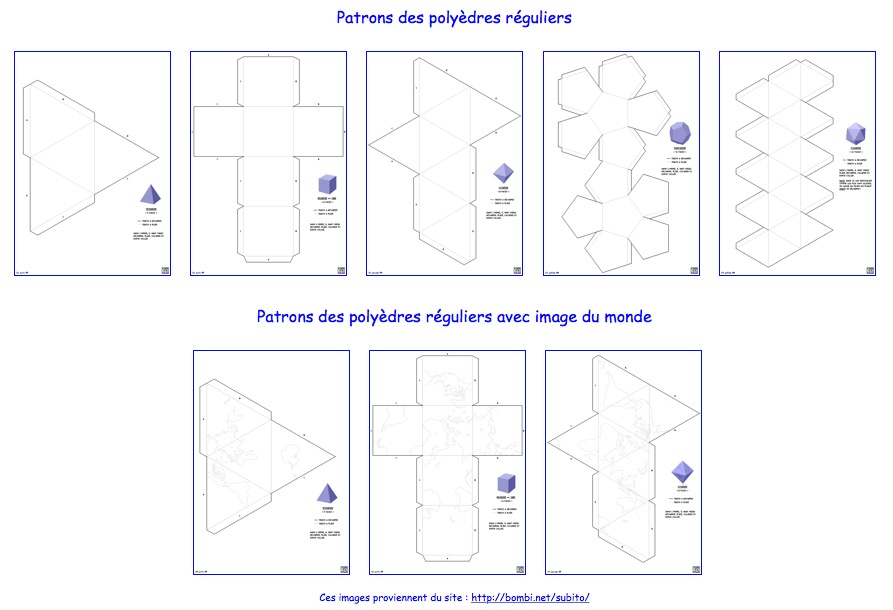 Sur cette page, vous trouverez différents développements de polyèdres à imprimer et à construire ou à faire construire à vos élèves. Ca peut être intéressant pour les thèmes 8 et 9 des livres de maths des 7 et 8H