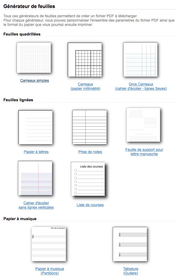 Générateur de feuilles: quadrillées, lignées, liste de courses, partition, etc. Par exemple, pour une feuille quadrillée, il est possible de choisir: Format A4, Lettre US, cahier d'écolier, Orientation portrait, paysage Carreaux simples, papier millimétré, Taille marge, taille du quadrillage (...)