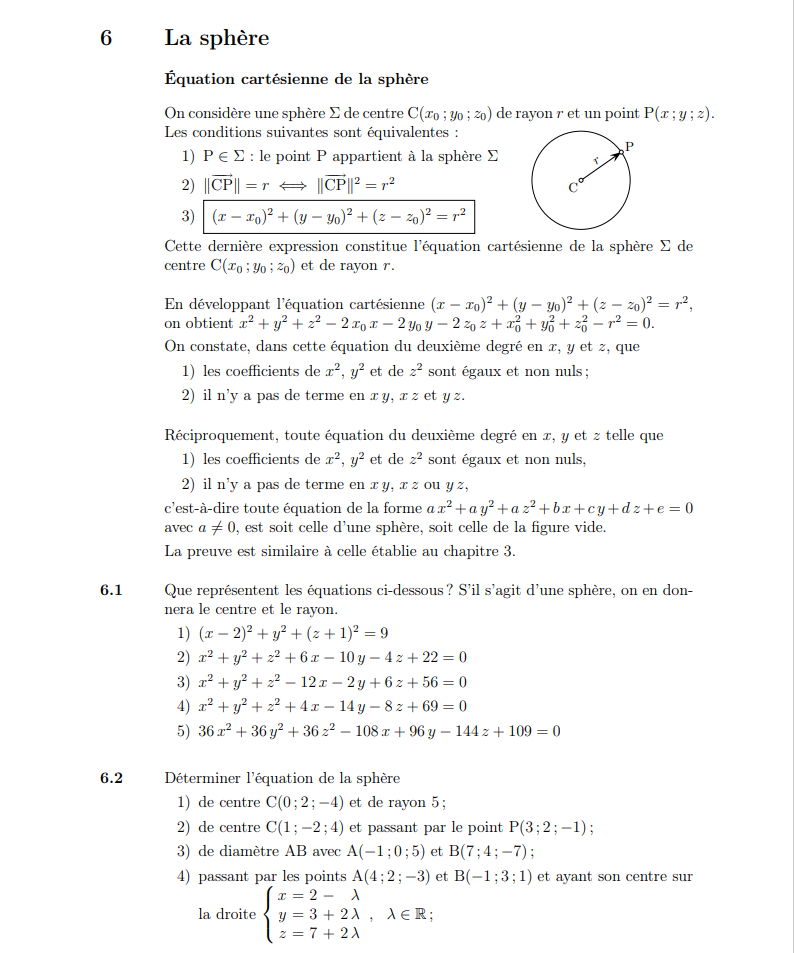 Ce support de cours sur la sphère (géométrie dans l'espace) est à destination des enseignants de mathématiques du Gymnase ayant des volées de 3e année en école de maturité niveau renforcé. On y retrouve les thèmes suivants : Équation cartésienne la sphère Plan tangent à une sphère