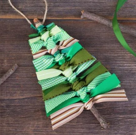 Entre 13 et 16 bandes pour chaque ornement. Attacher les bouts de ruban ou des bouts de tissus à la brindille ou au bâton de cannelle.