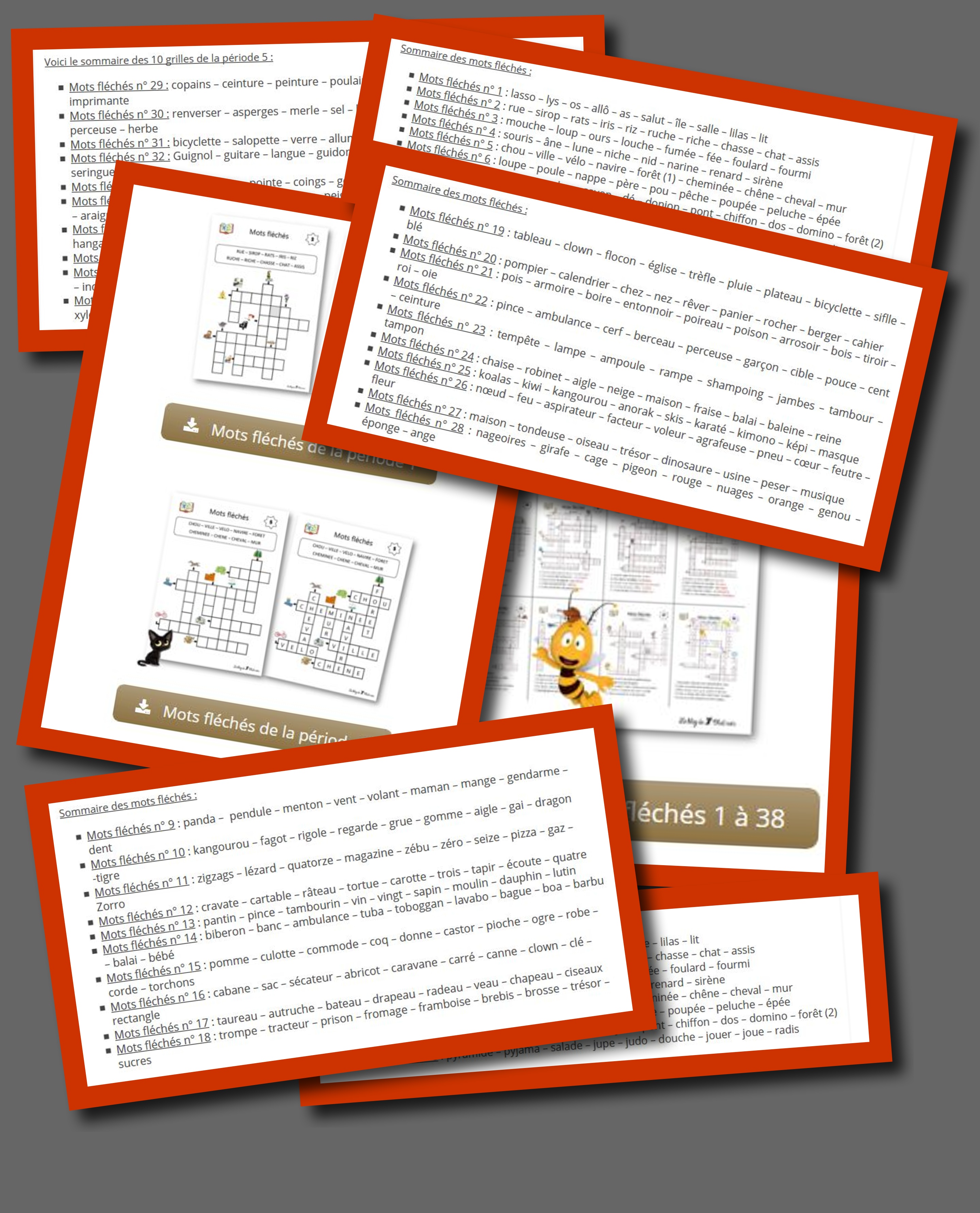 Les modèles des mots figurent en haut de la fiche, afin que les enfants puissent les lire puis les recopier en capitales dans la grille. Mais on peut proposer aux élèves les plus à l’aise un cache pour ne pas utiliser les modèles et apprendre à mémoriser l’orthographe des mots. 38 mots fléchés (...)