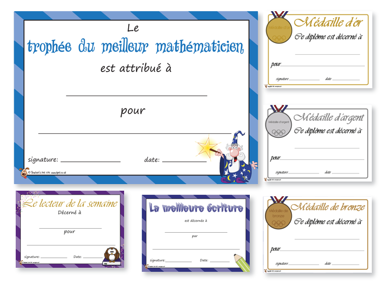 Diplômes à télécharger : Diplômes pour récompenser les élèves : la meilleure écriture, le lecteur de la semaine, le meilleur élève de la semaine ou le grand mathématicien. Nous vous proposons aussi le thème olympique avec le certificat d'argent et de bronze ou d'or ! https://www.bdrp.ch/lien (...)