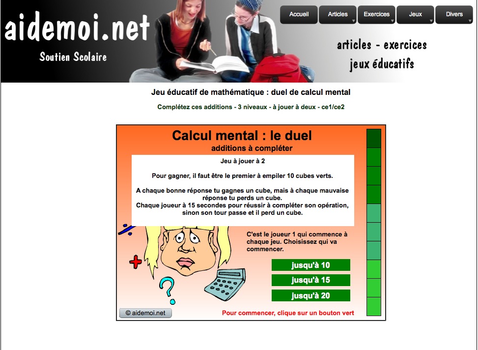 Calcul mental: le duel Des addition en colonne à compléter. Ce jeux se joue à deux, chaque joueur a 15 secondes pour compléter son opération. S'il réussit il gagne un cube, s'il rate il perd un cube. Il faut être le premier à empiler 10 cubes verts.