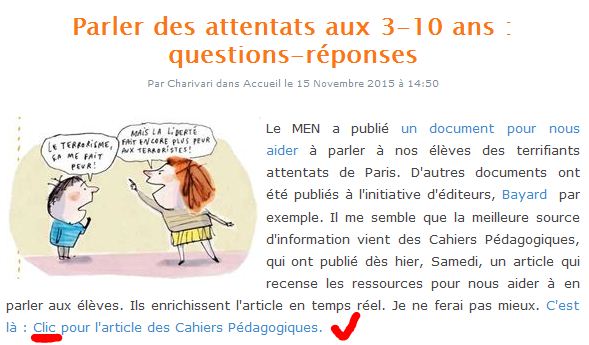 Charivari dit : J'ai, de mon côté, cherché des réponses à certaines questions que je me posais. Je vous livre ces questions, et les réponses trouvées (avec leur source). -----> Super article..Bien détaillé... Cliquez aussi : http://www.cahiers-pedagogiques.com/Des-ressources-pour-parler-avec-les (...)