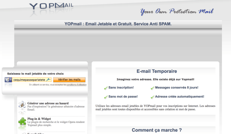YopMail. Un mail jetable et gratuit pour éviter les spams YopMail est un service en ligne qui vous fournit une adresse mail jetable. Une adresse mail provisoire qui disparaîtra au bout d’un certain temps sans laisser de traces.