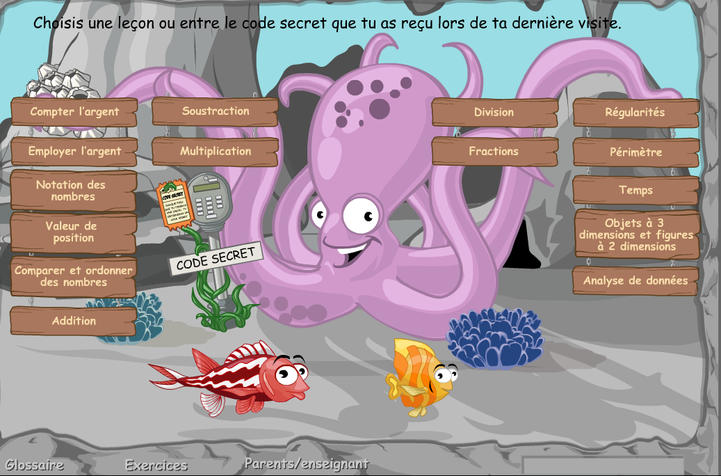 Superbe site , où on trouve des exercices sous forme de quête. Divers thèmes sont abordés. Numération, introduction à la géométrie , calculs....