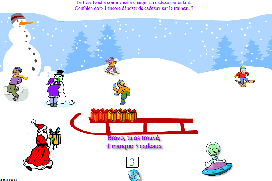 Petit jeu qui consiste à compter le nombre d'enfants présents sur le dessin et trouver combien de cadeaux manquent afin que chaque enfant reçoive un cadeau.