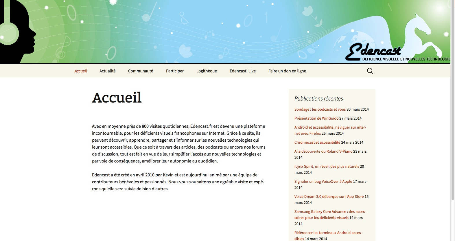 La plateforme Edencast.fr permet aux déficients visuels francophones de partager et s’informer sur les nouvelles technologies qui leur sont accessibles. Des articles, podcasts et forums de discussion les aident à simplifier leur accès aux nouvelles technologies et donc à améliorer leur autonomie (...)