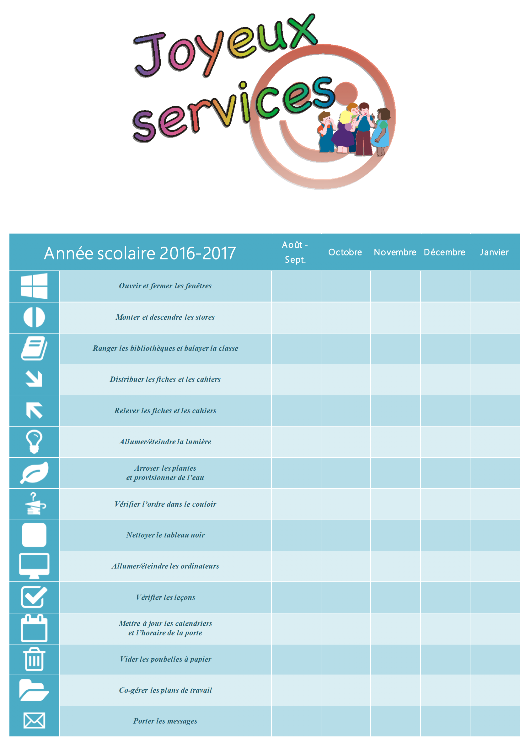 Souvent, dans l'organisation de sa classe, les élèves ont une tâche, un service,.... à effectuer régulièrement pendant une période définie. Ce tableau permet d'indiquer le roulement pour une série de tâches fixes. Certaines de ces tâches peuvent être effectuées par 2 élèves simultanément afin d'en (...)