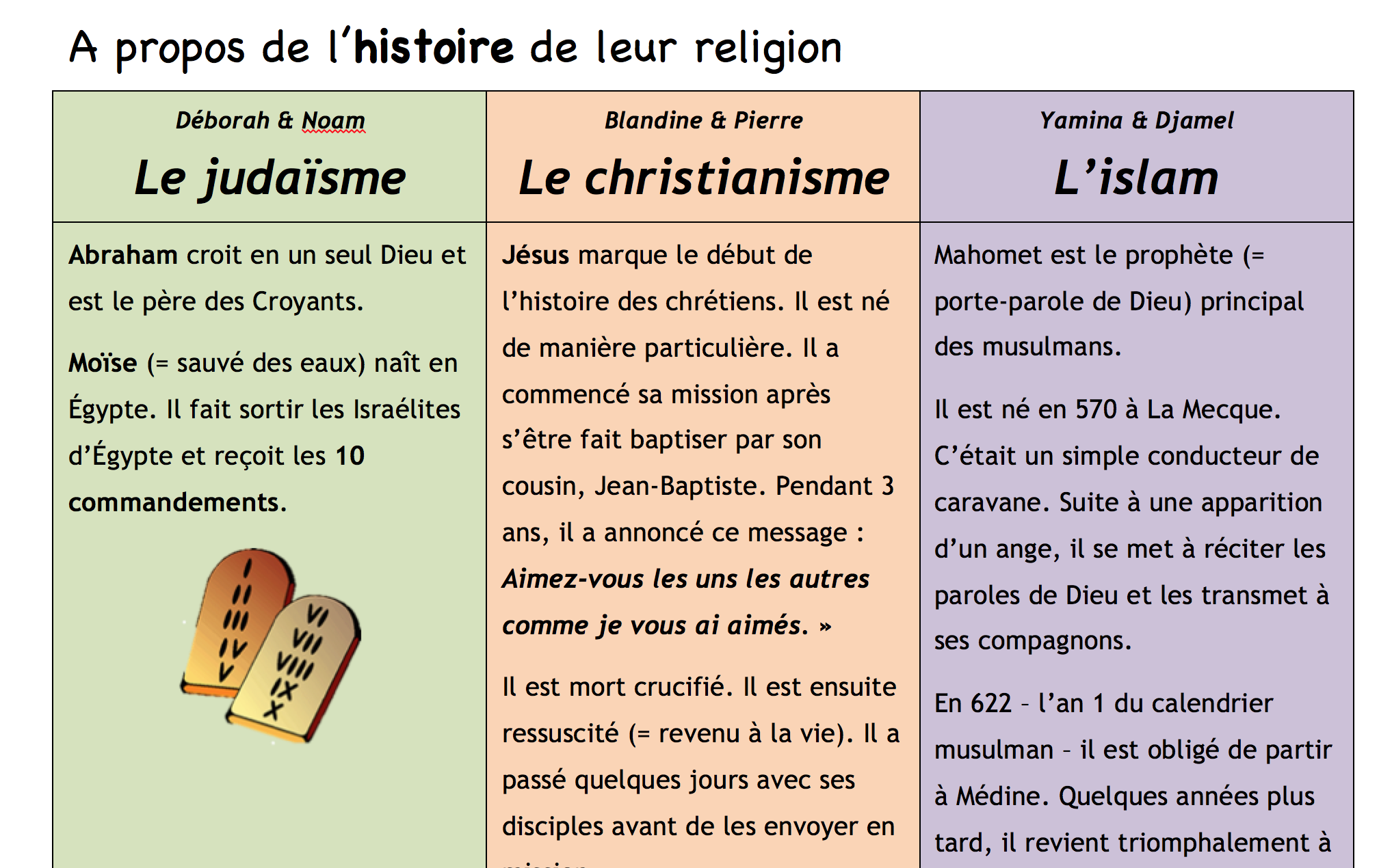 Activité de découverte des religions monothéistes et comparaison d'un point de vue historique et de la vie quotidienne. Ce module se base sur la recherche d'information sur internet, pour ensuite les comparer et les synthétiser. Fiche de l'enseignant, synthèse pour les élèves et fiches PDF du site (...)