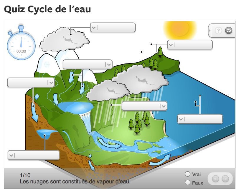 Didacticiel proposé par Edumedia sur le cycle de l'eau. Questions à choix multiples qui permet de révisier ses connaissances sur le cycle de l'eau et les états de l'eau, principalement.