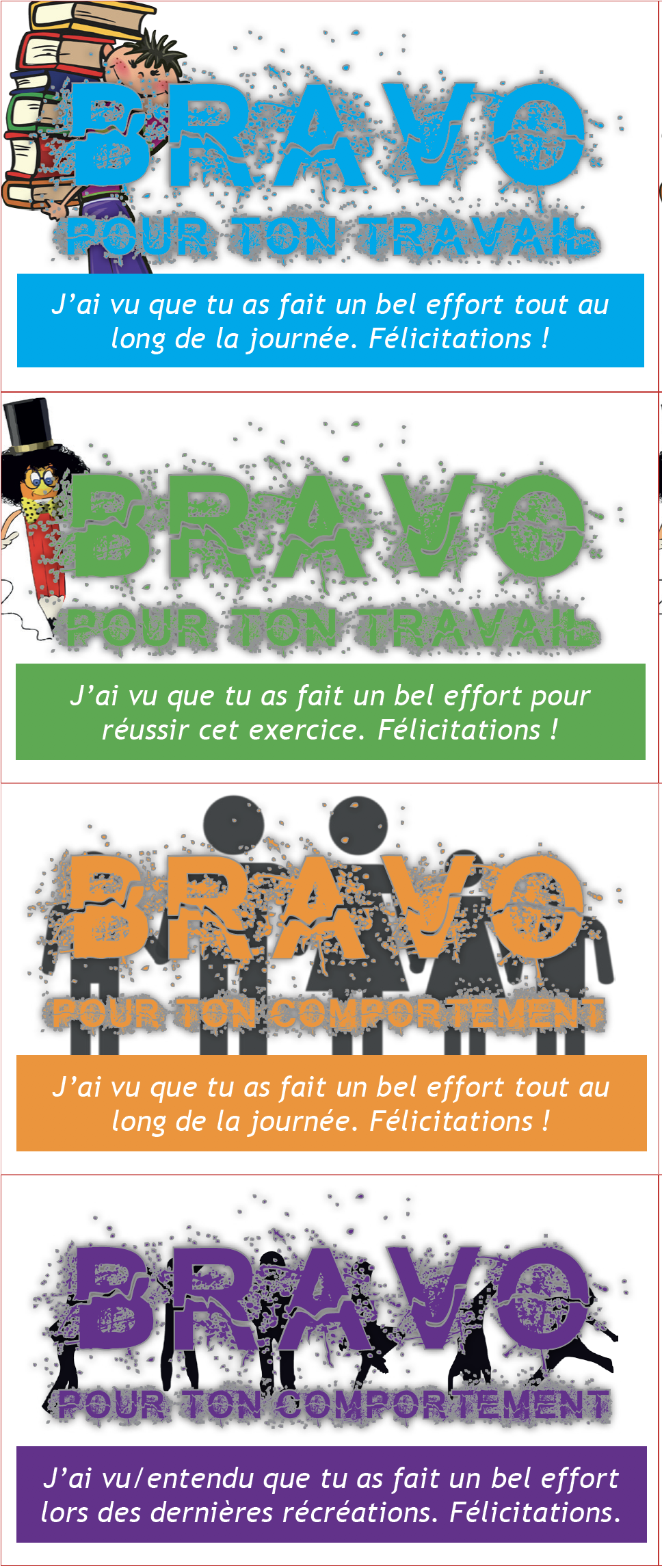 Encourager nos élèves est important ! Ces bons permettront d'y penser et de le faire de manière tangible. Ils permettent de le faire sur 4 plans : le travail en général, pournune journée un travail particulier le comportement en général pour une journée le comportement aux récréations Il vous suffit (...)