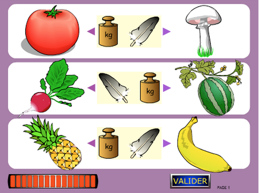 Ce jeu de comparaison de masses est un jeu éducatif pour enfants à partir de 4 ans. Les élèves doivent définir entre deux images, lequel de ces objets est le plus lourd et lequel est le plus léger. Ils indiquent ceci à l'aide d'un poids (pour le plus lourd) et d'une plume (pour le plus léger). Les (...)