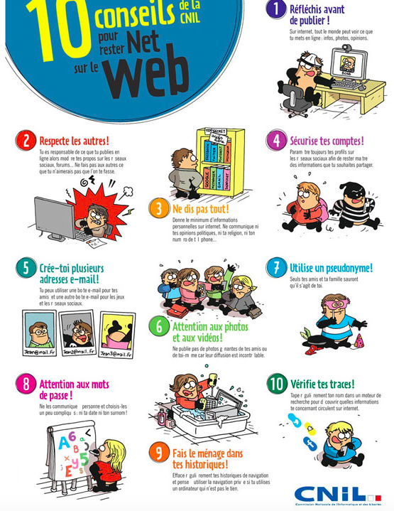 Poster destiné aux élèves résumant les 10 conseils pour utiliser le net avec responsabilité.