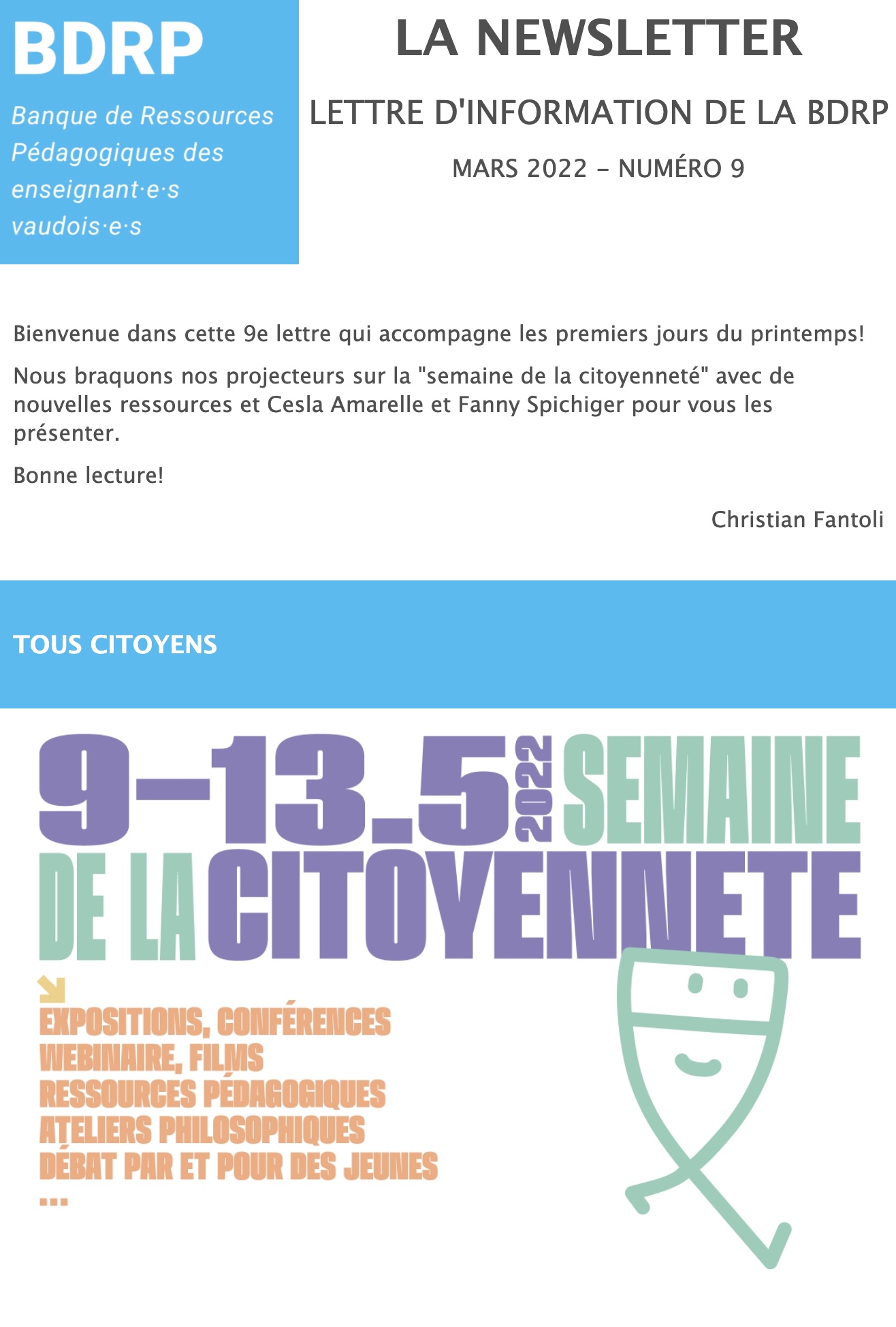 Notre lettre de diffusion du printemps braque ses projecteurs sur la "semaine de la citoyenneté" avec de nouvelles ressources et Cesla Amarelle et Fanny Spichiger pour vous les présenter! La BDRP propose plusieurs fois par année une lettre de diffusion proposant des ressources couvrant des thèmes (...)