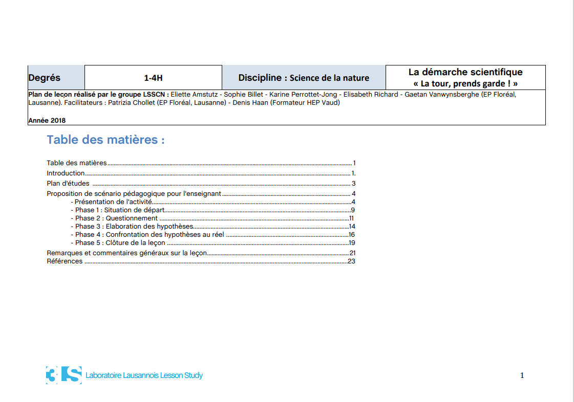 Degré : 1-4H Discipline : Science de la nature Mots clés : Démarche scientifique, critères de stabilité d’un objet Date : 2018 Vous pouvez retrouver l'ensemble des plans de leçons du Laboratoire Lausannois Lesson Study (3LS) sur le site web suivant: Laboratoire Lausannois Lesson Study (3LS).