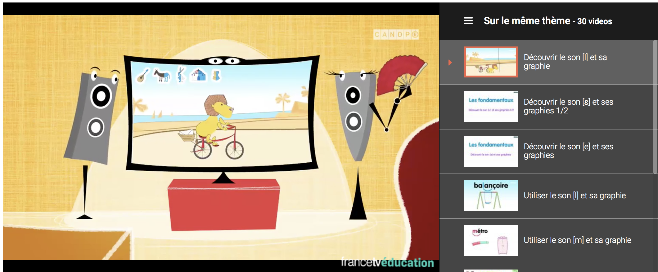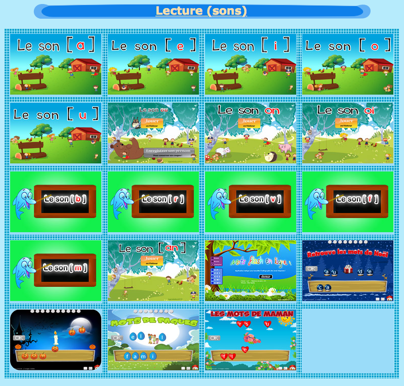 Une série de vidéos, avec le texte associé. Chaque vidéo travaille un son particuler.
