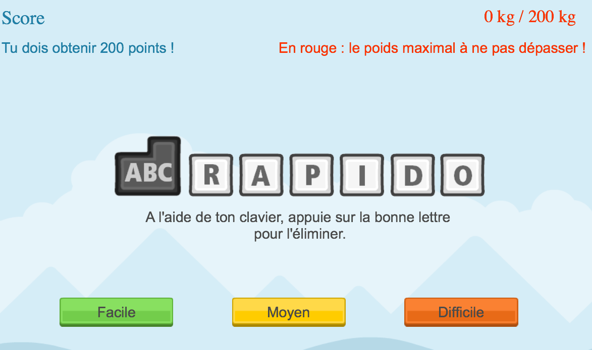 Un deuxième jeu en ligne qui propose d’améliorer son utilisation du clavier. But du jeu : faire disparaître les lettres en les retrouvant sur le clavier, tout ça avant qu’elles ne touchent le sol. 3 niveaux de vitesse pour gagner en rapidité. Ce site propose aux plus grands élèves une iniation à la (...)