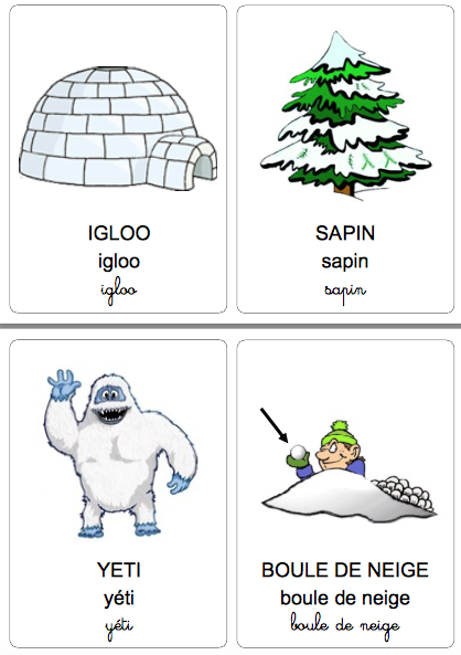 Imagier à imprimer sur le thème de l'hiver. Les mots sont écrits avec diverses polices