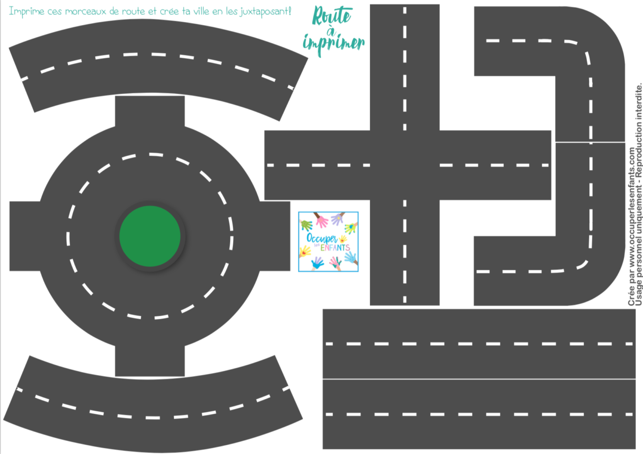 Pour les minis voitures, le format mini ; pour les voitures taille standard, sur 2 feuilles A4. Imprimer le nbre de routes désirées.... sur papier bristol puis plastifier. (évent. prévoir des bandes de velcro autocollantes qui dépassent de certaines pièces pour solidifier les parcours ; ou utiliser (...)