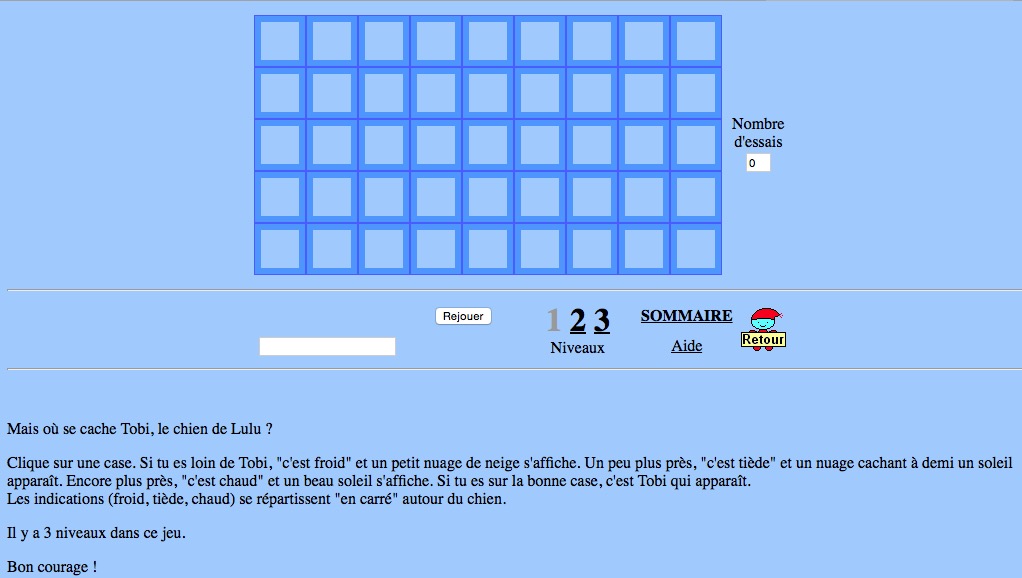 Jeu du "chaud-froid" facile et auto-correctif pour les 1-2H. Il y a 3 niveaux de difficulté. Les élèves adorent! En provenance du site "les jeux de lulu, le lutin malin". http://jeux.lulu.pagesperso-orange.fr/