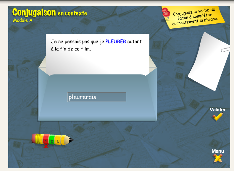 Conjuguer le verbe aux modes, temps et personnes indiqués . Difficile! • 11 modules de 20 verbes • Impression des résultats détaillés • Exercices d'entraînement